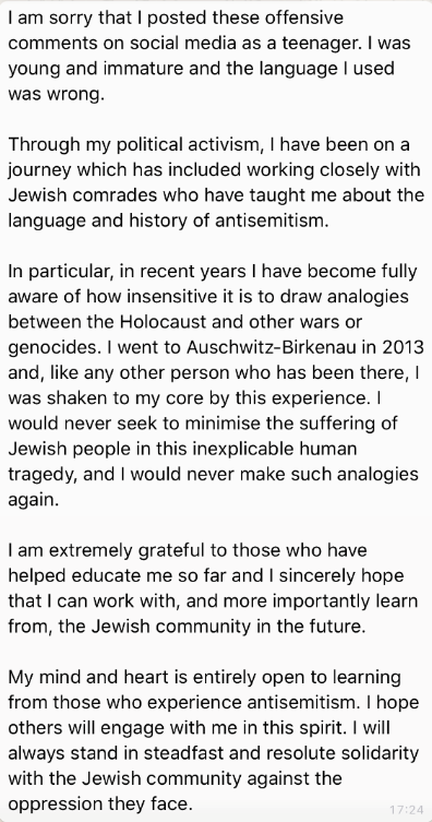 On 15th November 2019, it was reported that Ms Sultana had published a statement on Twitter in which she said: “I am sorry that I posted these offensive comments on social media as a teenager. I was young and immature and the language I used was wrong. Through my political activism I have been on a journey which has included working closely with Jewish comrades who have taught me about the language and history of antisemitism.” We note that Ms Sultana, who is now only 26, was apparently referring in her apology to the tweets revealed by LBC, including [5]. However, her other statements were posted while an adult at university. We further note that these were posted after her visit to Auschwitz in 2013, a trip which she claimed had left her determined “never to minimise the suffering of Jewish people.”
